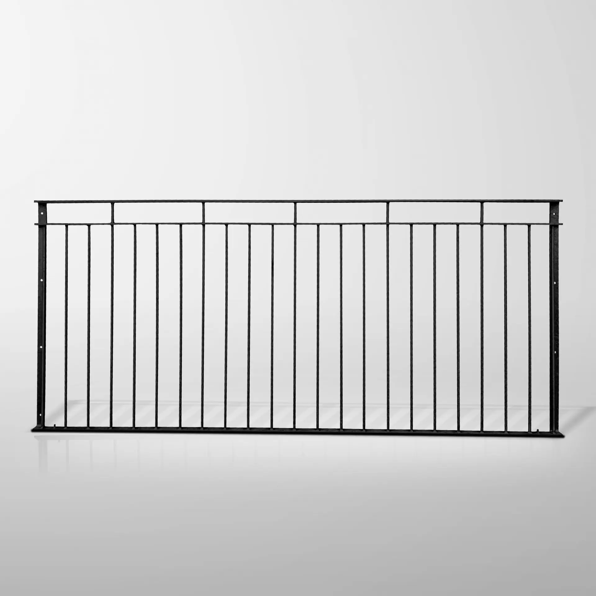The framework features a double top rail, crafted from convex bar with evenly spaced inserts, adding a touch of refinement. The flat bar bottom rail is paired with 12mm round bar infill rails for a sturdy and elegant structure. On each side, vertical fixing plates made from 40 x 8mm flat bar provide secure installation, each with four evenly spaced fixing holes.
