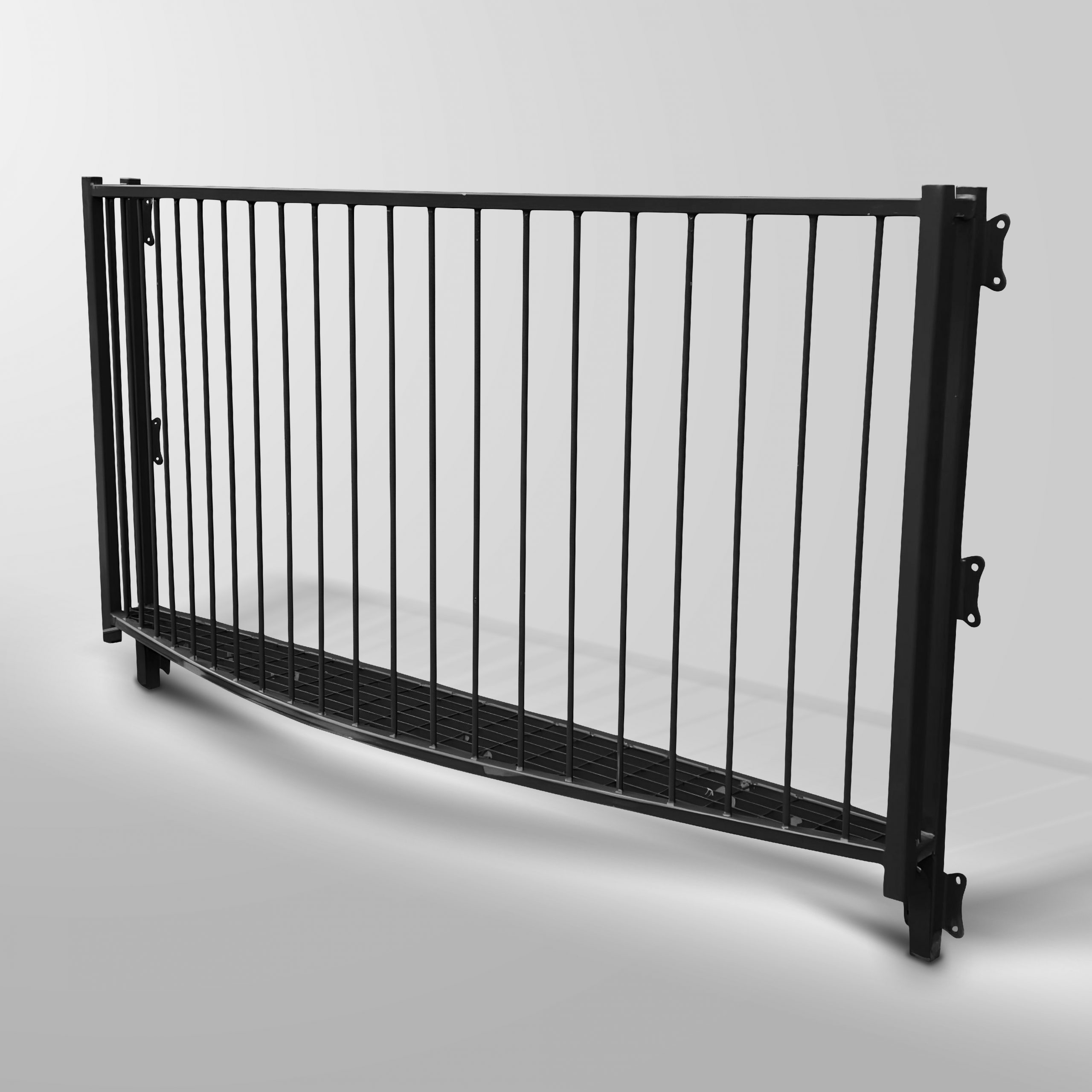 The framework consists of a curved top and bottom rail with a box section, along with 12mm round bar infill rails. On each side, there are three square fixing plates measuring 120mm wide. Each fixing plate has four fixing holes, one in each corner. Our platform base is made with a box section frame and a steel mesh made from 25mm x 3mm flat bar in a cross section of 41mm by 100mm.